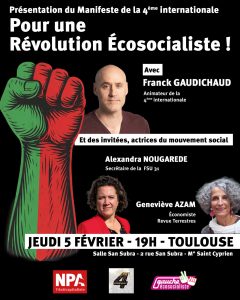 Avec Frank Gaudichaud animateur de la IV° internationale qui présentera le manifeste écosocialiste, et des invitées actrices du mouvement social, Alexandra Nougarede co-secrétaire de la FSU et Geneviève Azam économiste revue Terrestre.